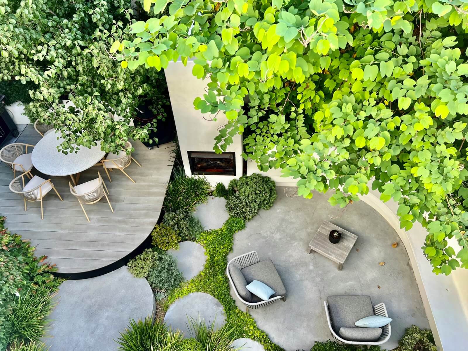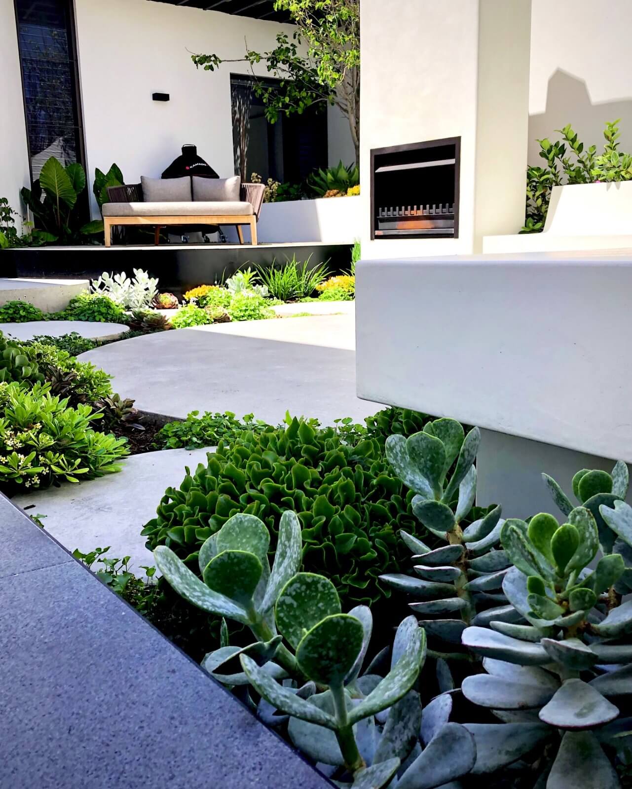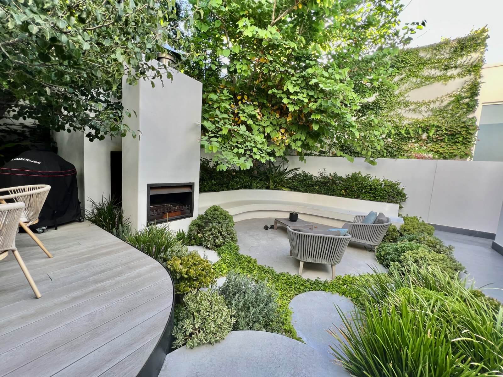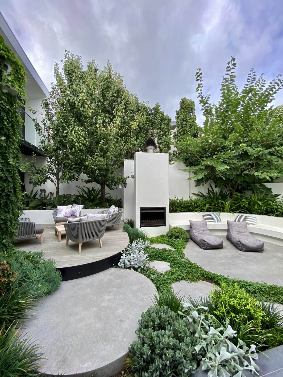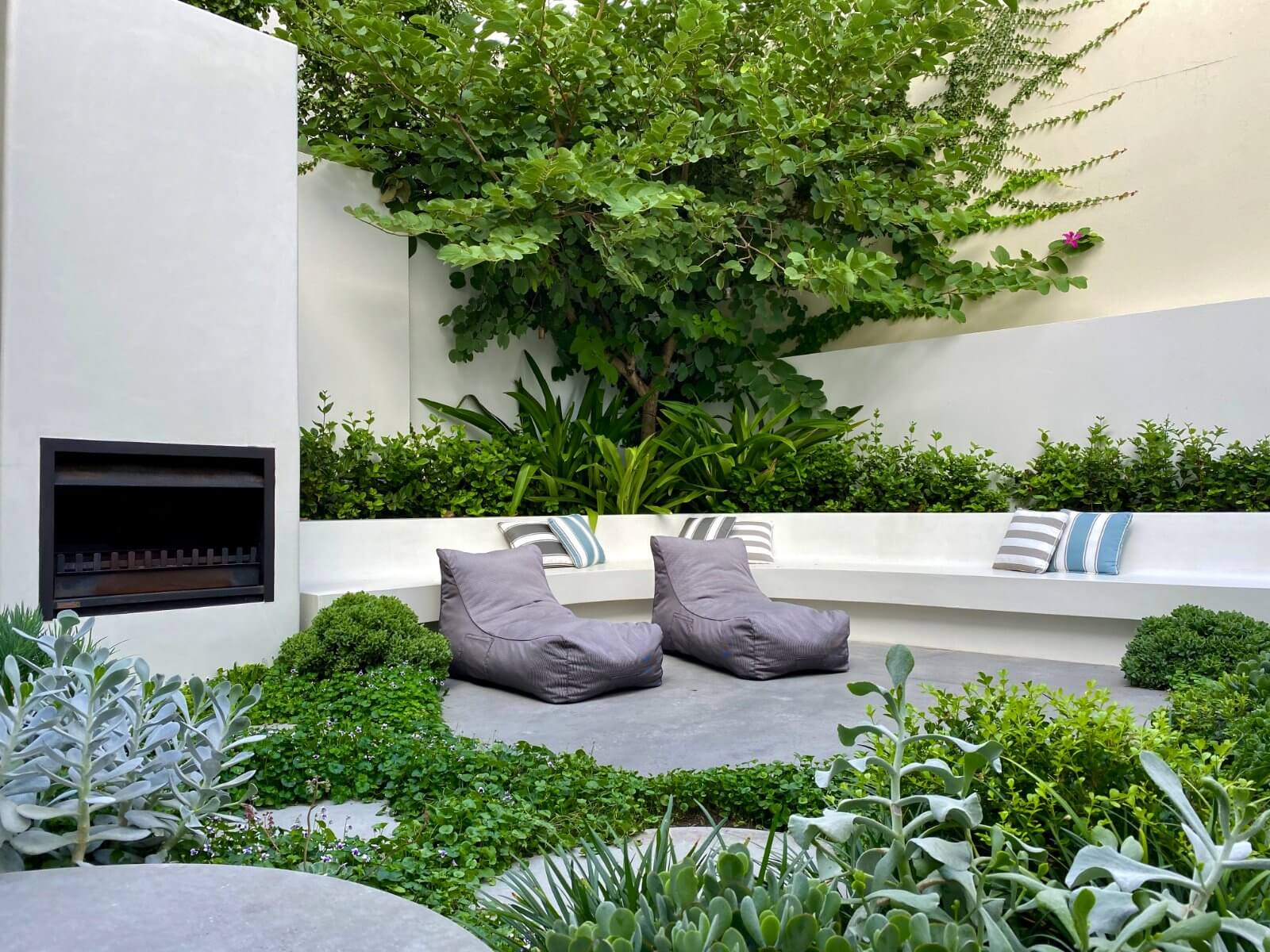 Feature Fireplace – Custom built microcement fireplace and built-in seating